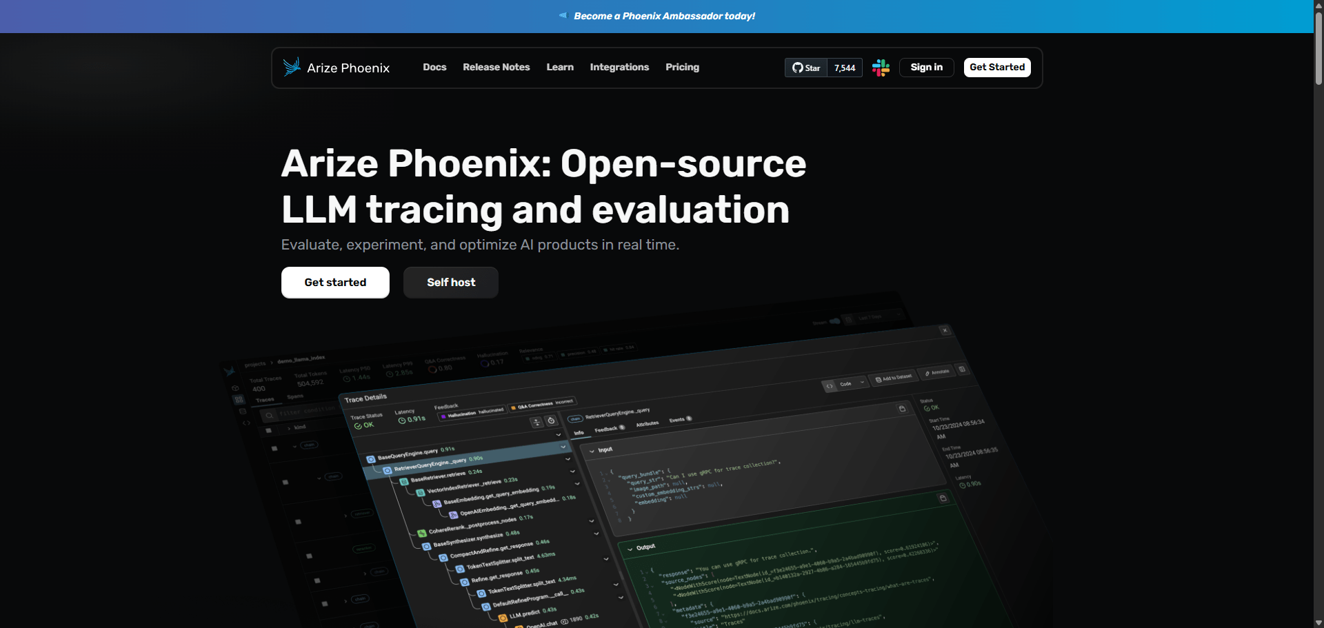 The platform helps users evaluate, monitor, and optimize LLM applications in real time — providing transparency across every decision your model makes. Phoenix captures detailed traces, integrates seamlessly with frameworks like LangChain, and supports both cloud-hosted and self-hosted deployments.